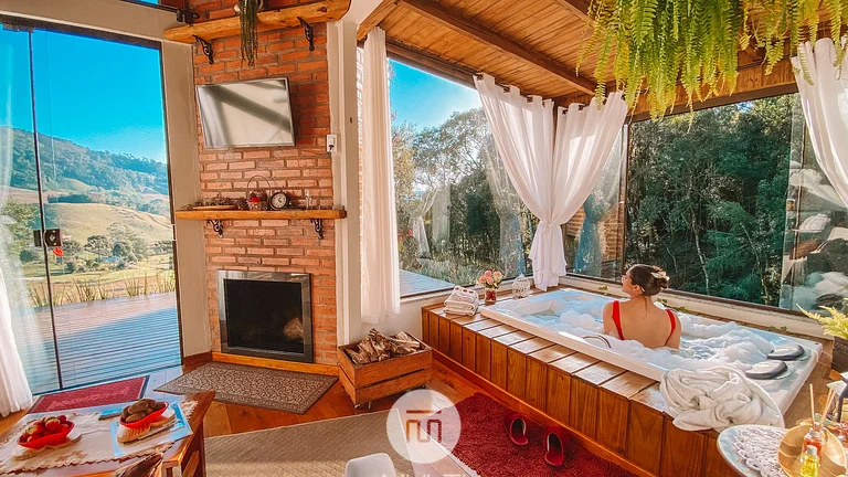 Opção de alto padrão com hidromassagem com vista linda para as montanhas. A propriedade sofisticada inclui cama queen, ar-condicionado, cozinha completa e varanda com balanço, oferecendo decoração moderna que equilibra luxo e conexão com a natureza. O design foi pensado para proporcionar renovação e tranquilidade ao casal — exatamente o que não se encontra nas arenas lotadas do Carnaval.